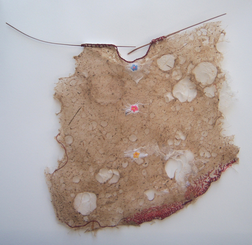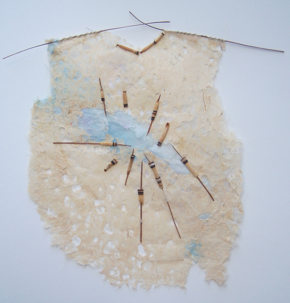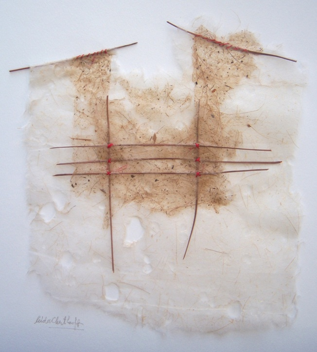 En las obras que integran la nueva muestra de Aída Chertkoff la artista abandona el tratamiento seriado de sus trabajos anteriores para instalarse definitivamente dentro del terreno de la obra única. La muestra, estructurada en dos sendas, comprende los trabajos agrupados bajo los nombres “Relicarios” y “Corazas”. De la mano de una extrema delicadeza y un compendio de sutilezas Aída trae de su memoria y los plasma en papel, los recuerdos y vivencias que deseó atesorar. En la primera serie, la utilización de piezas muy pequeñas y delicadas, que van desde antiguas figuritas de papel a elementos vegetales, y la elección del bordado como método de terminación para constituir los relicarios, nos presenta una obra hermosa y frágil, que habla tanto de lo volátil de la memoria como de la efímera condición de quien la ostenta.