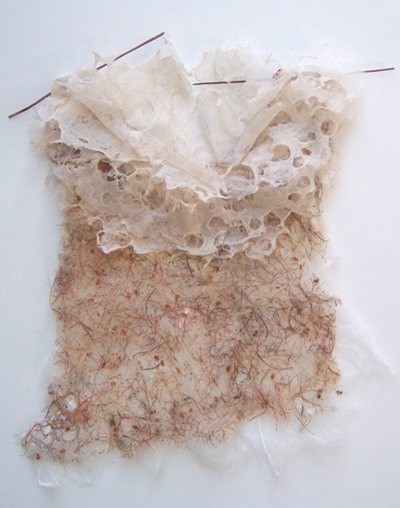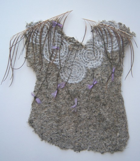 Por otro lado, en “Corazas” la tensión parece estar puesta en las consecuencias de los recuerdos y las vivencias, en los desgarros y cicatrices pero también en los buenos momentos transitados, la experiencia como aprendizaje y ganancia. Al mismo tiempo estas corazas, tan frágiles como los relicarios, nos envuelven en la fantasía de la protección, nos cobijan, nos amparan de los riesgos aunque sea de manera ilusoria. También en esta serie es fundamental la elección que la artista hace de los materiales con los que trabaja, acentuando el sentido que transmite la obra.