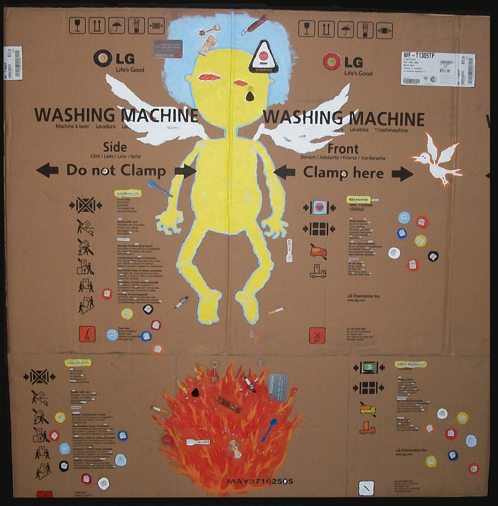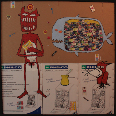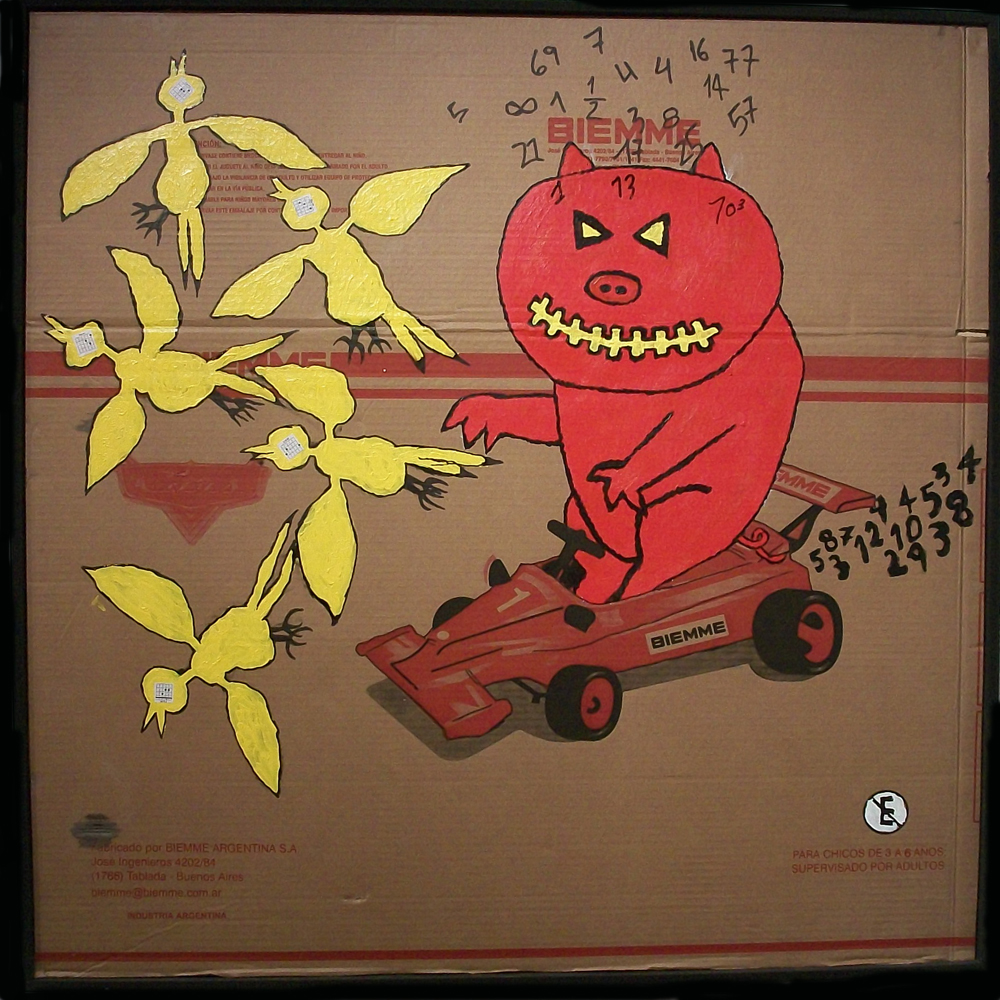 La potente obra de Enzo Palavecino se hace fuerte en la seducción que despierta a primera vista su trazo aniñado, su humor ingenuo, sus colores vivos. Como un cazador astuto nos guía hacia el cepo oculto que nos enfrentará a la crudeza de sus personajes, sumidos en un juego triste y desolador, un juego que fatalmente parece ineludible. Enzo nos plantea la lucha existencial del que busca pertenecer sin resignar su propia individualidad, siempre agobiado por la brutalidad contemporánea y los estatutos que imponen los nuevos usos y costumbres. Un ejemplo de esta manera de trabajar son las variadas resignificaciones que hace de la historia bíblica de Jonás y la ballena, pero en su visión no es a la furia de Yahveh a quien se debe enfrentar el protagonista si no a los imperativos del deber ser y dentro del animal someterse a sus propósitos.