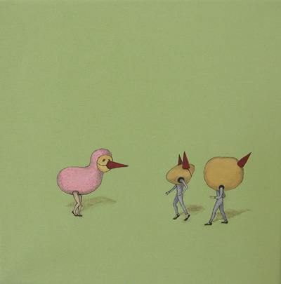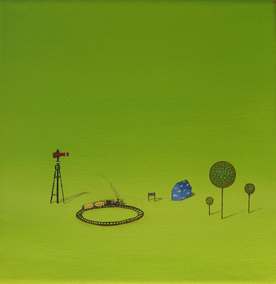 Un cuadrado sólido, mínimo, contiene un sueño, un acróbata, el niño que fuimos. Fragmentos de una obra que invitan a acomodar los cuadros de Pablo Mattioli en un rompecabezas sin patrón determinado, como un mapa de pequeños mosaicos oníricos. Y una vez reunirlos por colores. Otra, juntar los personajitos por las historias que cuentan. La siguiente, por la vida de los objetos que habitan los cuadros. Entonces jugaríamos con el pintor el juego mejor de la infancia, ese de descubrir figuras en las manchas, las sombras, los diseños recortados en la planicie de la pared para inventarles una historia.